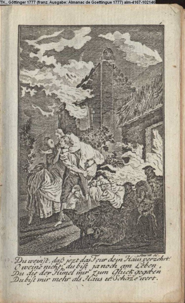 Du weinst, daß jezt das Feur dein Haus verzehrt! / O weine nicht, du bist ja noch am Leben, / Du die der Himmel mir zum Glück gegeben / Du bist mehr als Haus u. Schätze wert.
