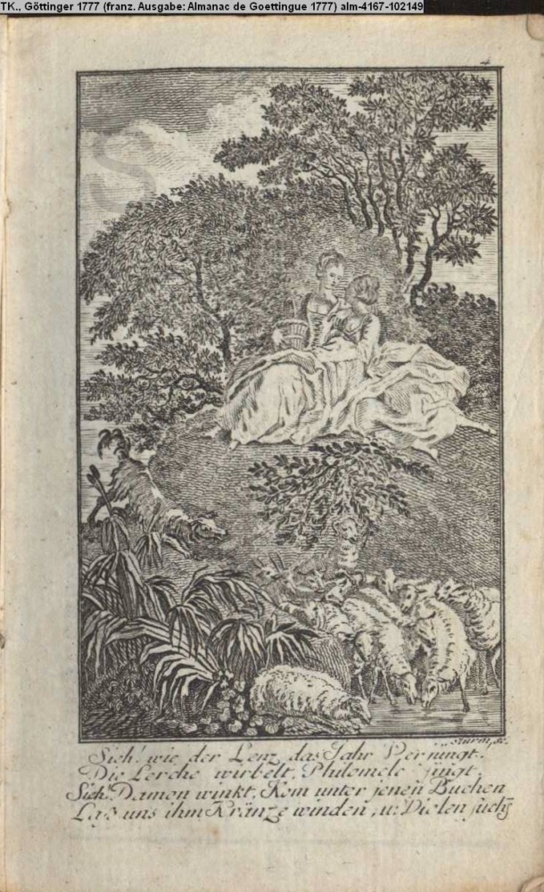 Sieh! wie der Lenz das Jahr Verjüngt! / Die Lerche wirbelt, Philomele singt. / Sieh! Damon winkt. Kom unter jenen Buchen / Laß uns ihm Kränze winden, u: Violen suchen