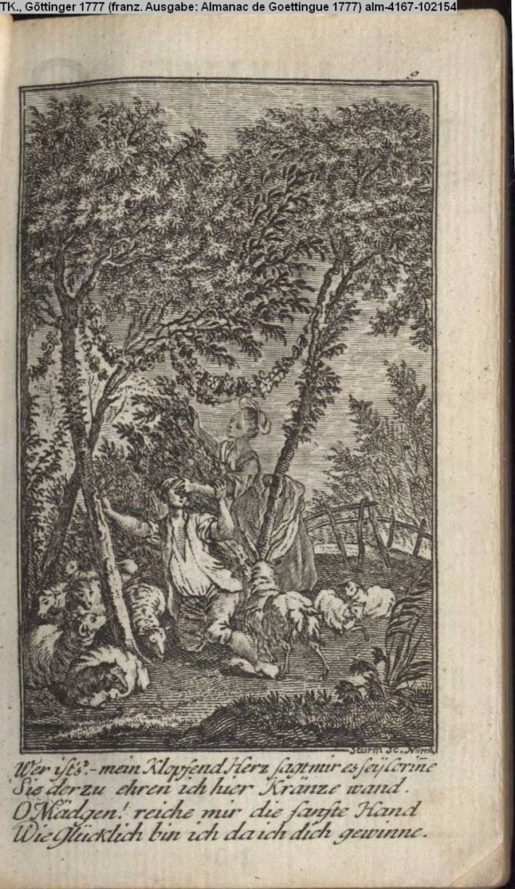 Wer ist's? mein Klopfend Herz sagt mir es sey Corinne / Sie der zu ehren ich hier Kränze wand. / O Mädgen! reiche mir die sanfte Hand / Wie Glücklich bin ich da ich dich gewinne.