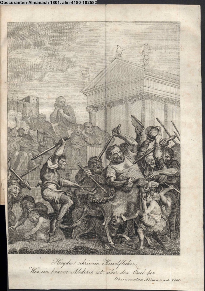 Heyda! schrie ein Kesselflicker, / Wer ein braver Abderit ist, über den Esel her. / Obscuranten Allmanach 1801