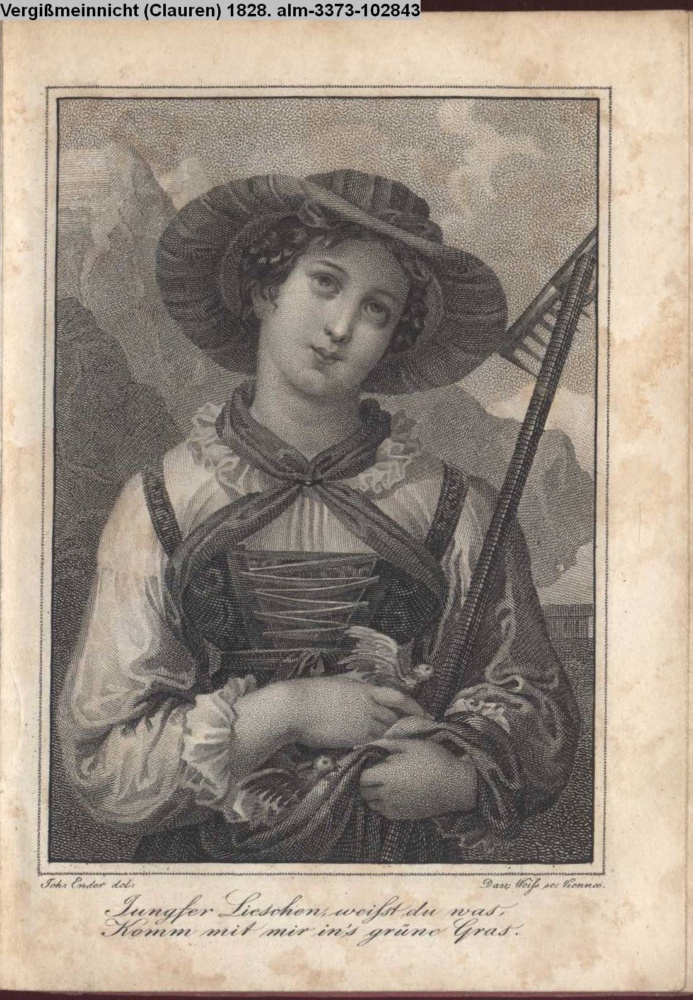 Illustration zu »Jungfer Lieschen weisst du was, Komm mit mir ins grüne Gras« in: Vergißmeinnicht (Clauren) 1827;