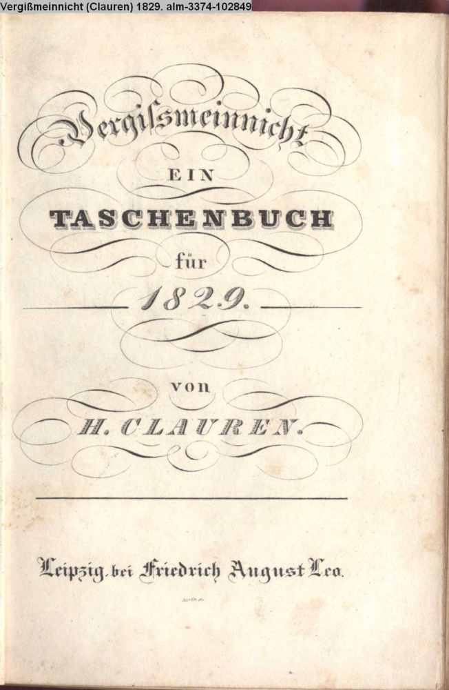 Vergissmeinnicht / Ein / TASCHENBUCH / für / 1829. / von / H. CLAUREN. / Leipzig, bei Friedrich August Leo