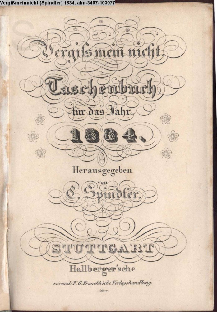 Vergiss mein nicht. / Taschenbuch / für das Jahr / 1834. / Herausgegeben / von / C. Spindler. / STUTTGART / Hallberger'sche / vormals F. G. Franckh'sche Verlagshandlung