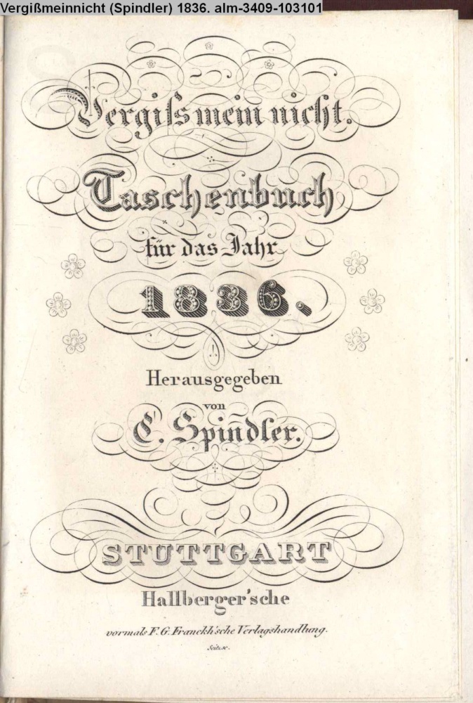 Vergiss mein nicht. / Taschenbuch / für das Jahr / 1836. / Herausgegeben / von / C. Spindler. / STUTTGART / Hallberger'sche / vormals F. G. Franckh'sche Verlagshandlung