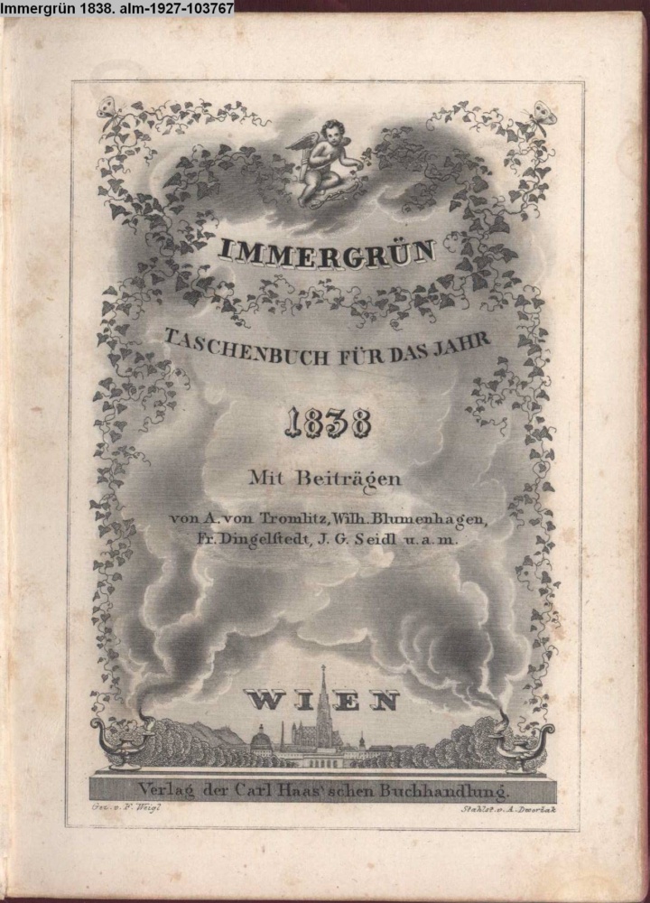 IMMERGRÜN / TASCHENBUCH FÜR DAS JAHR / 1838 / Mit Beiträgen / von A. von Tromlitz, Wilh. Blumenhagen, / Fr. Dingelstedt, J. G. Seidl u. a. m. / WIEN / Verlag der Carl Haas'schen Buchhandlung