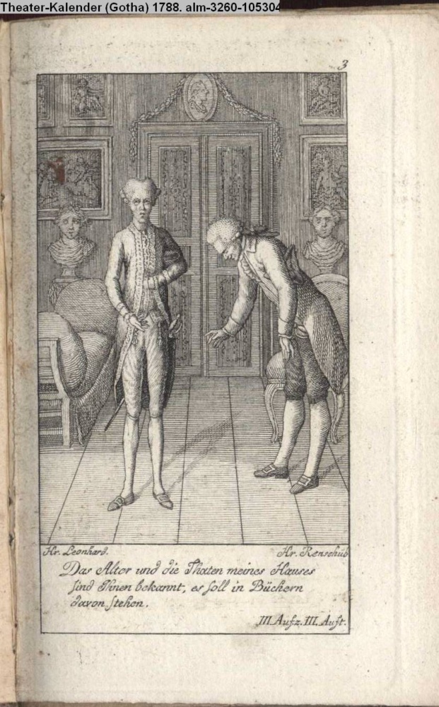 Hr. Leonhard Hr. Renschüb / Das Alter und die Thaten meines Hauses / sind Ihnen bekannt, es soll in Büchern / davon stehen. / III. Aufz. III. Auftr.