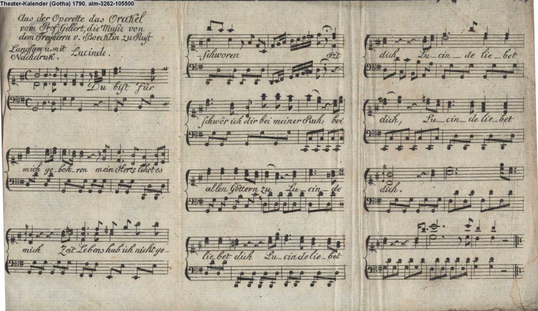 Aus der Operette das Orakel / vom Prof. Gellert, die Musik von / dem Freyherrn v. Boecklin zu Rust