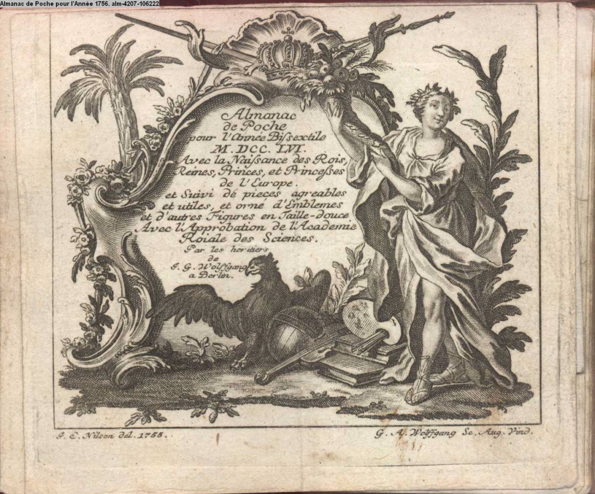 Almanac / de Poche / pour l'Année Bissextile / M.DCC.LXVI. / Avec la Naissance des Rois, / Reines, Princes, et / Princesses de l'Europe./ et Suivi de pieces agreables / et utiles, et orné d'Emblemes / et d'autres Figures en Taille-douce. / Avec l'Approbation de l'Academie / Roiale des Sciences / Par les heritiers / de / J. G. Wolffgang / à Berlin