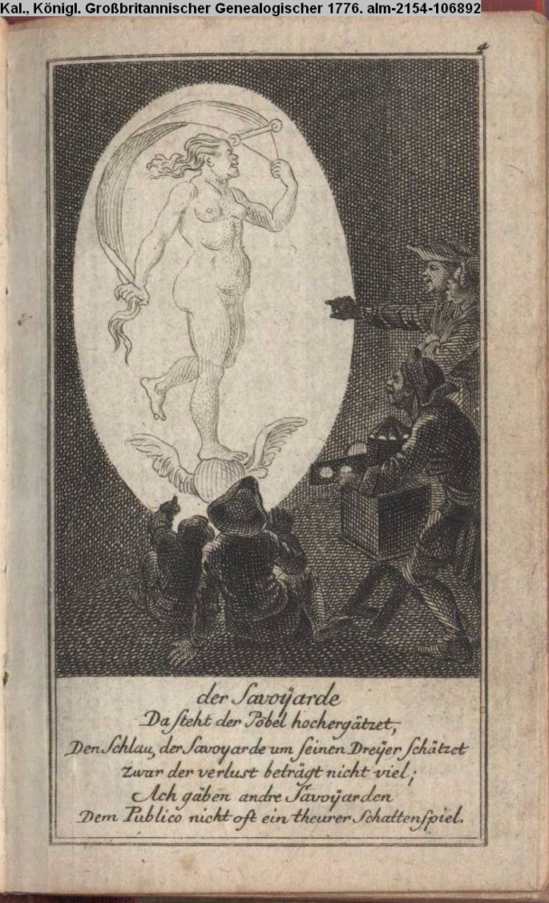 der Savoyade / Da steht der Pöbel hochergätzet, / Den Schlau der Savoyarde um seinen Dreyer schätzet
