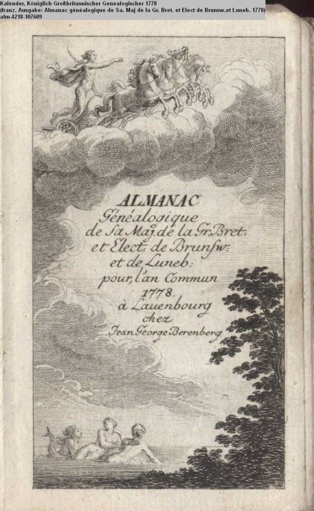 ALMANAC / Généalogique / des Sa Maj. de la Gr. Bret. / et Elect. de Brunsw. / et de Luneb. / pour l'an Commun / 1778. / à Lauenburg / chez / Jean George Berenberg