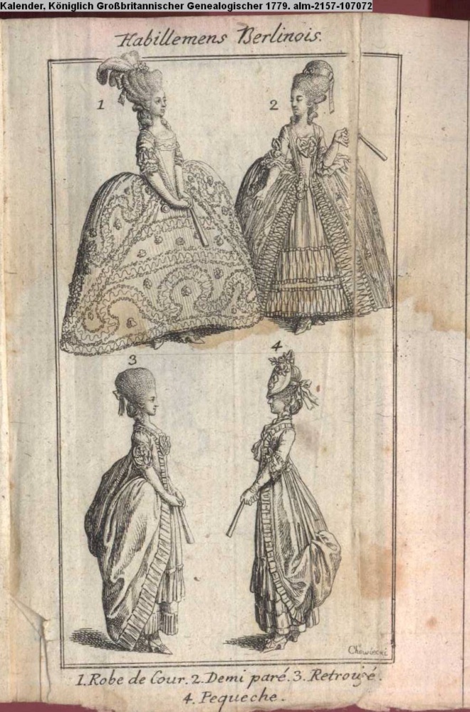 Habillemens Berlinois. / 1. Robe de Cour 2. Demi paré. 3. Retroussé. / 4. Pequeche