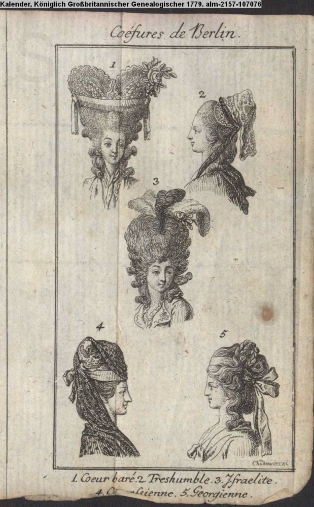 Coéfures de Berlin. / 1. Coeur baré. 2. Treshumble. 3. Israelite. / 4. Circassienne. 5. Georgienne