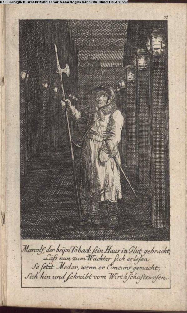Marcolf, der beym Toback sein Haus in Glut gebracht, / Lässt nun zum Wächter sich erlesen [...]