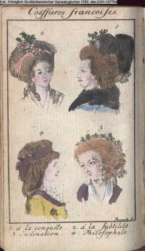 Coëffures francoises. / 1 à la conquète. 2. à la subtilité / 3. Inclination. 4. Philosophale