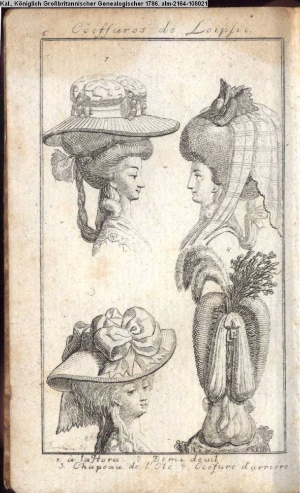 Coeffures de Leipsic / 1. à la Hora. 2. Demi deuil. / 3. Chapeau de l'Été. 4. Coefure d'arrière