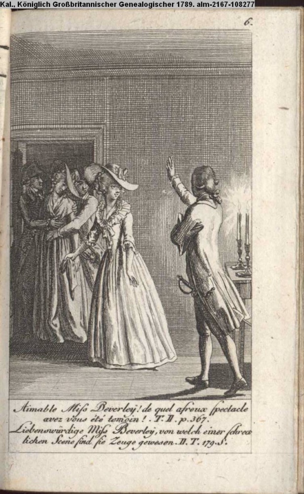 Aimable Miss Beverley! de quel afreux spectacle / avez vous été temoin! T. II. p. 367 / Liebenswürdige Miss Beverley, von welch einer schreck- / lichen Scene sind sie Zeuge gewesen. II. T. 179. S.