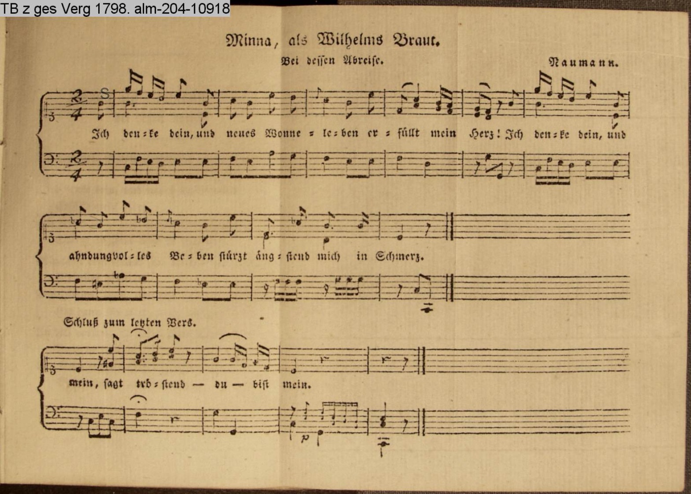 Vertonung des Gedichts »Minna, als Wilhelms Braut. Bei dessen Abreise« von Elisa d. i. Charlotte Elisabeth von der Recke