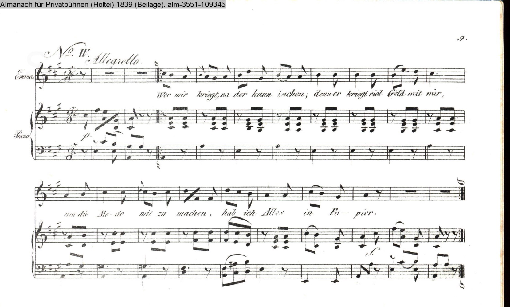 Seite 9 der Beilage mit Vertonung zu »Ein Achtel vom großen Los« von Karl v. Holtei