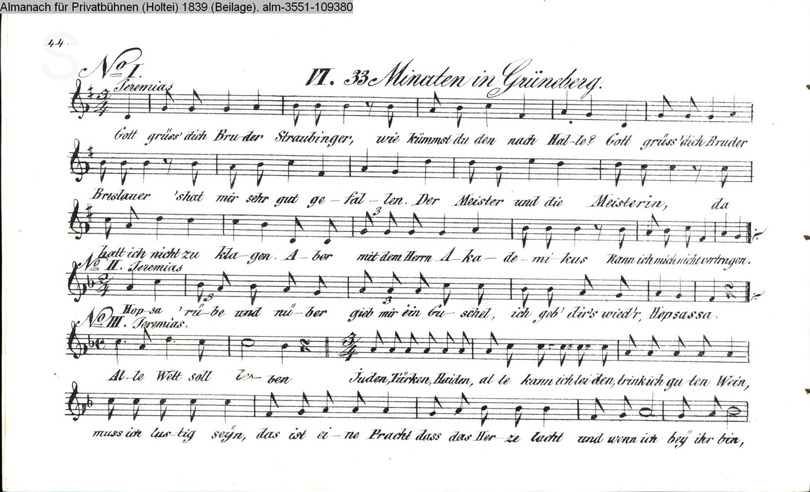 Seite 44 der Beilage mit Vertonungen zu »Dreiunddreißig Minuten in Grüneberg« von Karl v. Holtei