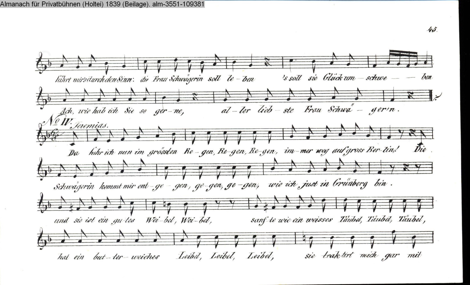 Seite 45 der Beilage mit Vertonungen zu »Dreiunddreißig Minuten in Grüneberg« von Karl v. Holtei