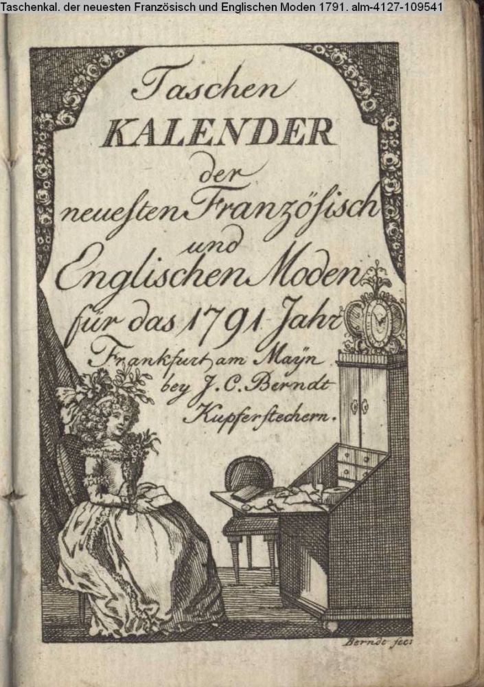 Taschen / KALENDER / der / neuesten Französisch / und Englischen Moden / für das 1791 Jahr / Frankfurt am Mayn / bey J. C. Berndt / Kupferstechern