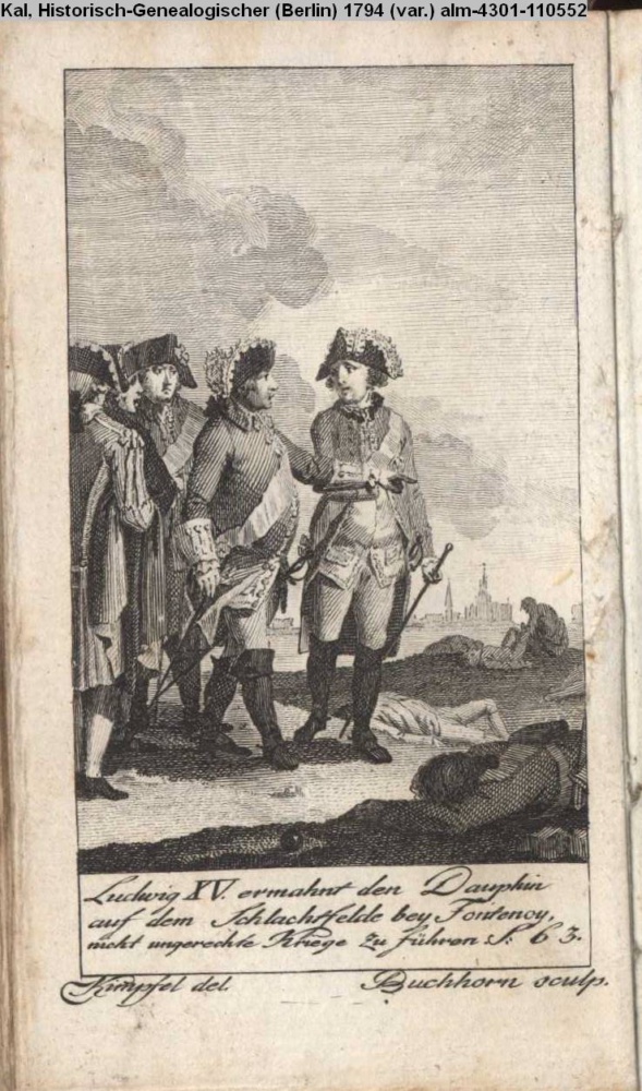 Die Graphik INr 58289: Kimpfel del. D. H. fecit nach Buchhorn, mit dem Titel: »Ludwig XV ermahnt den Dauphin auf dem Schlachtfelde bey Fontenay, nicht ungerechte Kriege zu führen S. 63 « ist hier (wie in der französischen Ausgabe des Kalenders) statt des 7. Blatts (ohne Titel, Plattenzustand Ia) der Suite »12 Blätter zu der Brandenburger Geschichte« wie bei Buchorn 1677-1688 und bei Engelmann 712 II c. beigegeben