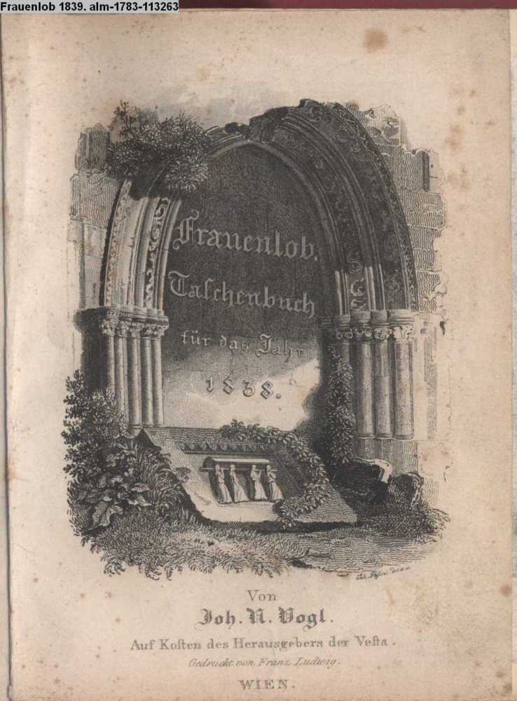 Frauenlob. / Taschenbuch / für das Jahr / 1838. / Von / Joh. N. Vogl. / Auf Kosten des Herausgebers der Vesta. / Gedruckt von Franz Ludwig. / Wien