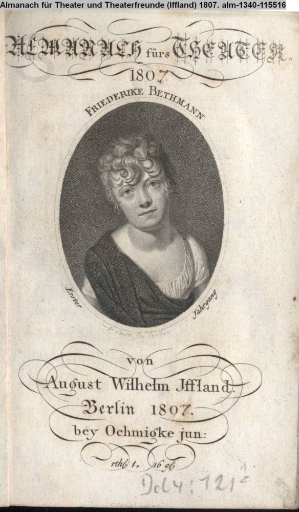 ALMANACH fürs THEATER. / 1807. / FRIEDERIKE BETHMANN / Erster Jahrgang / von / August Wilhelm Iffland. / Berlin 1807. / bey Oehmigke jun. / rthl. 1, 16 gG.