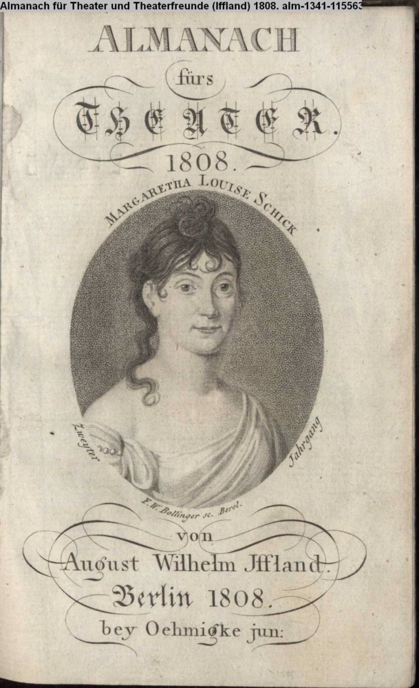 ALMANACH / fürs / THEATER / 1808 / MARGARETE LOUISE SCHICK / von / August Wilhelm Iffland. / Berlin 1808. / bey Oehmigke jun.