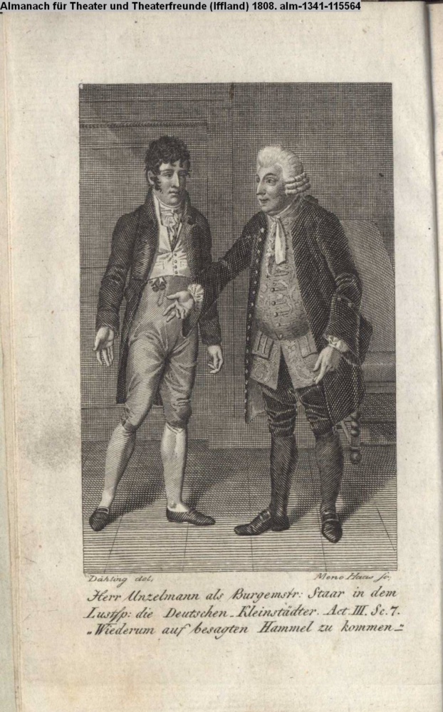 Herr Unzelmann als Burgemstr. Staar in dem Lustsp.: die Deutschen Kleinstädter. Act. III. Sc. 7. / Wiederum auf besagten Hammel zu kommen