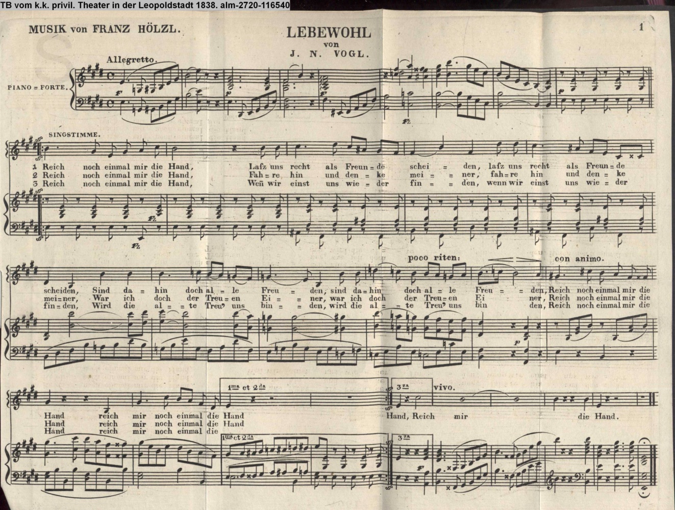Vertonung des Gedichts »Lebewohl« von J. N. Vogl