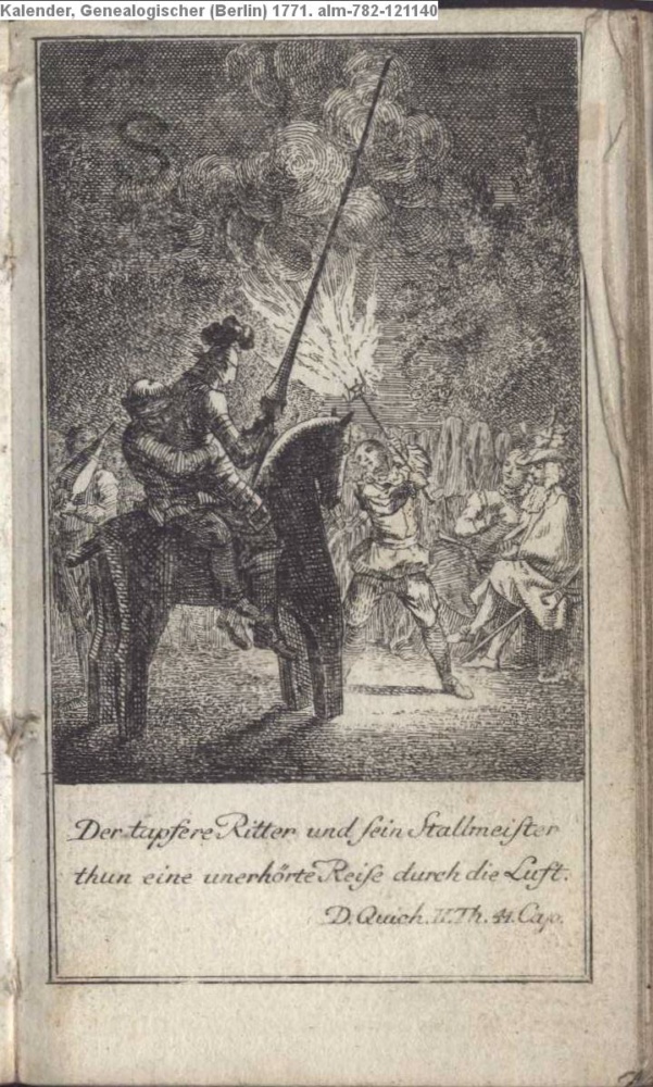 Der tapfere Ritter und sein Stallmeister / thun eine unerhörte Reise durch die Luft. / D. Quich. II. Th. 31. Cap.