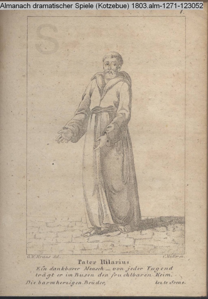1. / Pater Hilarius / Ein dankbarer Mensch – von jeder Tugend trägt er im Busen den fruchtbaren Keim. / Die barmherzigen Brüder, letzte Scene