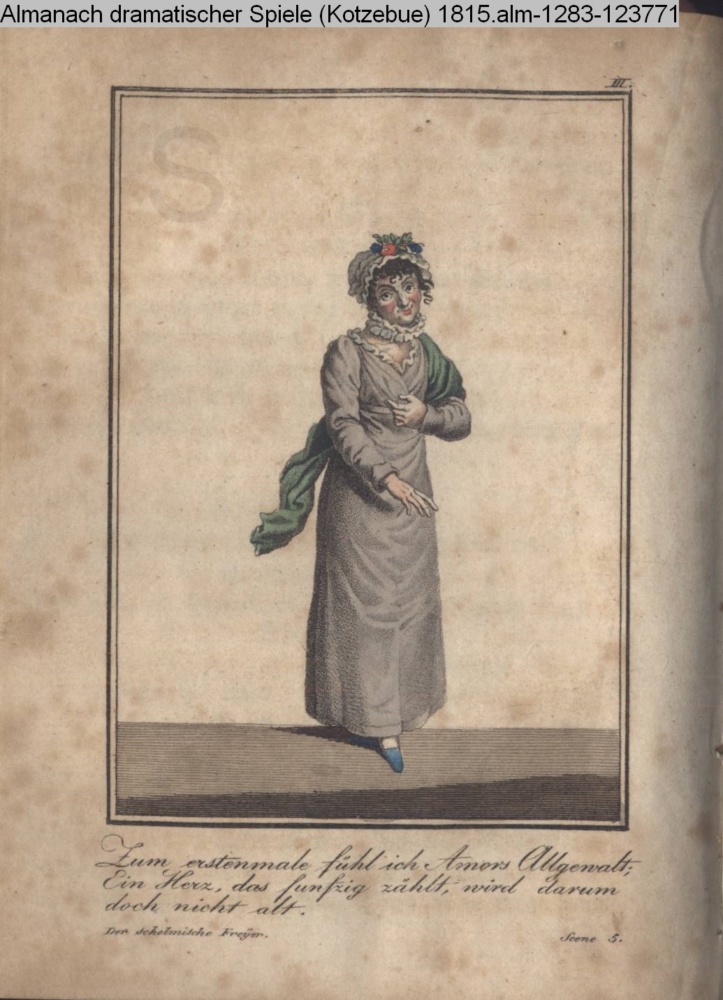 III. / Zum erstenmale fühl ich Amors Allgewalt; / Ein Herz, das fünfzig zählt, wird darum / doch nicht alt. / Der schelmische Freyer. Scene 5