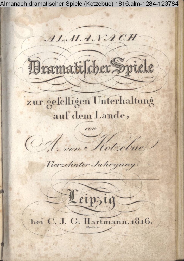 ALMANACH / Dramatischer Spiele / zur geselligen Unterhaltung / auf dem Lande / von / A. von Kotzebue. / Vierzehnter Jahrgang / Leipzig. / bei C. J. G. Hartmann 1816 / Martin sc.