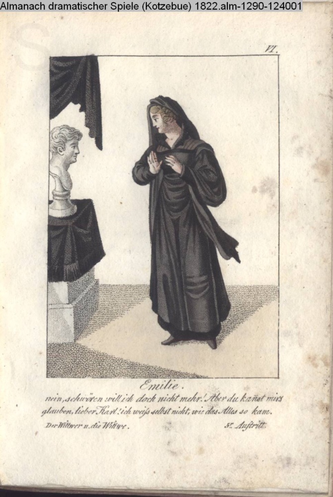 VI. / Emilie. / nein, schwören will ich doch nicht mehr! Aber du kannst mirs / glauben, lieber Karl! ich weiß selbst nicht, wie das Alles so kam. / Der Wittwer u. die Wittwe. 5r Auftritt