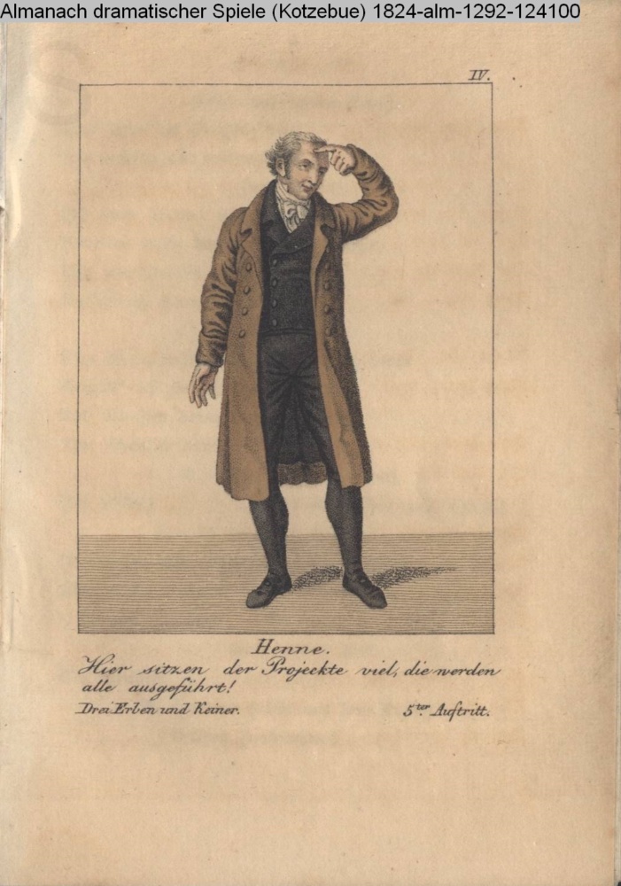 IV. / Henne. / Hier sitzen der Projeckte viel, die werden / alle ausgeführt! / Drei Erben und Keiner. 5ter Auftritt.