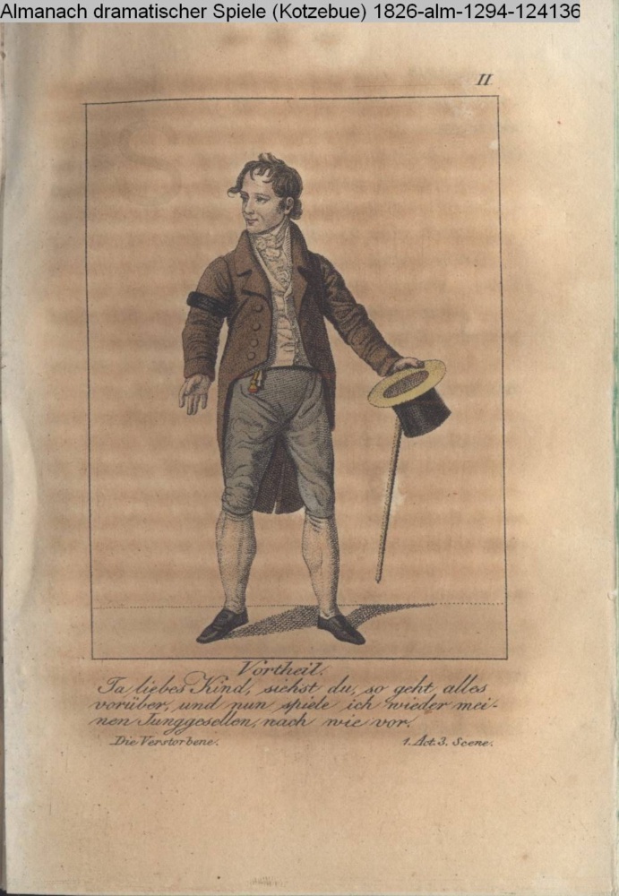 II. / Vortheil. / Ja liebes Kind, siehst du, so geht alles / vorüber, und nun spiele ich wieder mei- / nen Junggesellen nach wie vor. / Die Verstorbene. 1. Act. 3. Scene