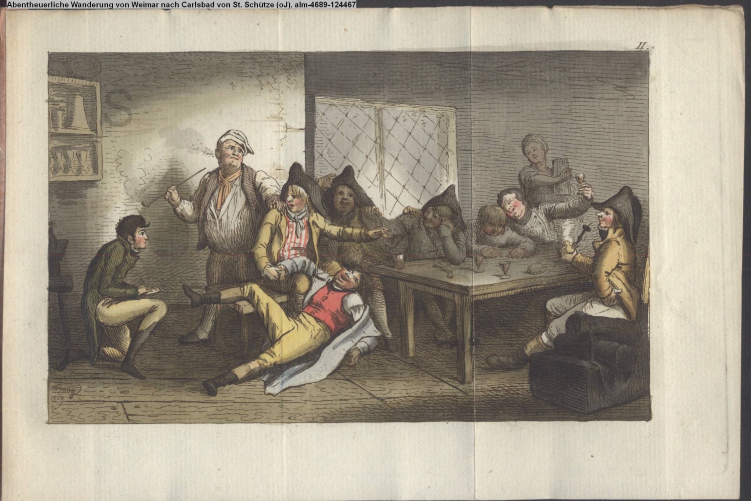 Nummerierung II.; auszufaltende kol. Illustration zu »Abentheuerliche Wanderung von Weimar nach Carlsbad« von St. Schütze