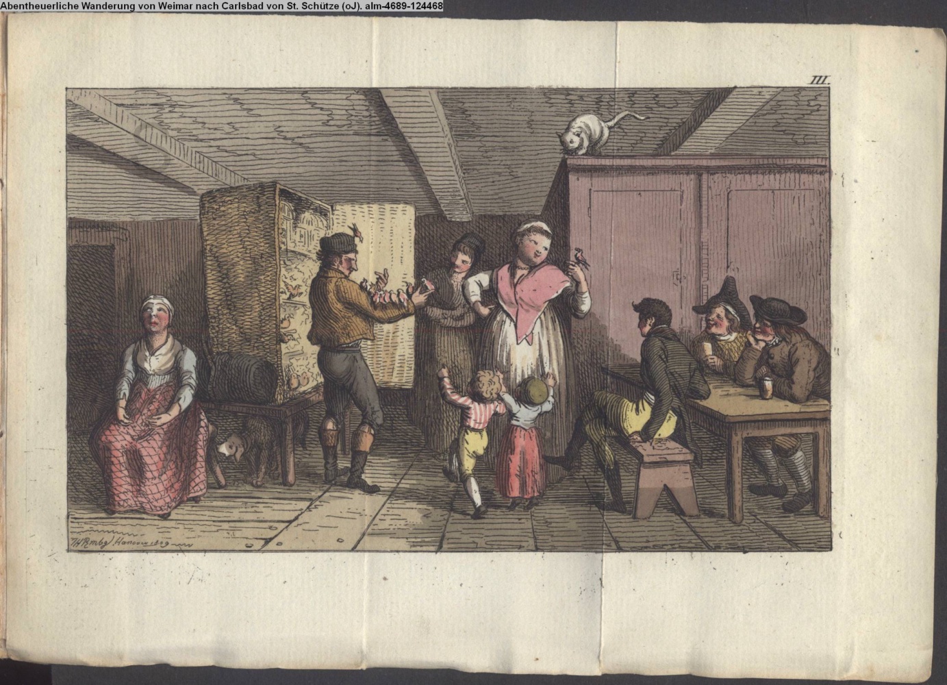 Nummerierung III.; auszufaltende kol. Illustration zu »Abentheuerliche Wanderung von Weimar nach Carlsbad« von St. Schütze