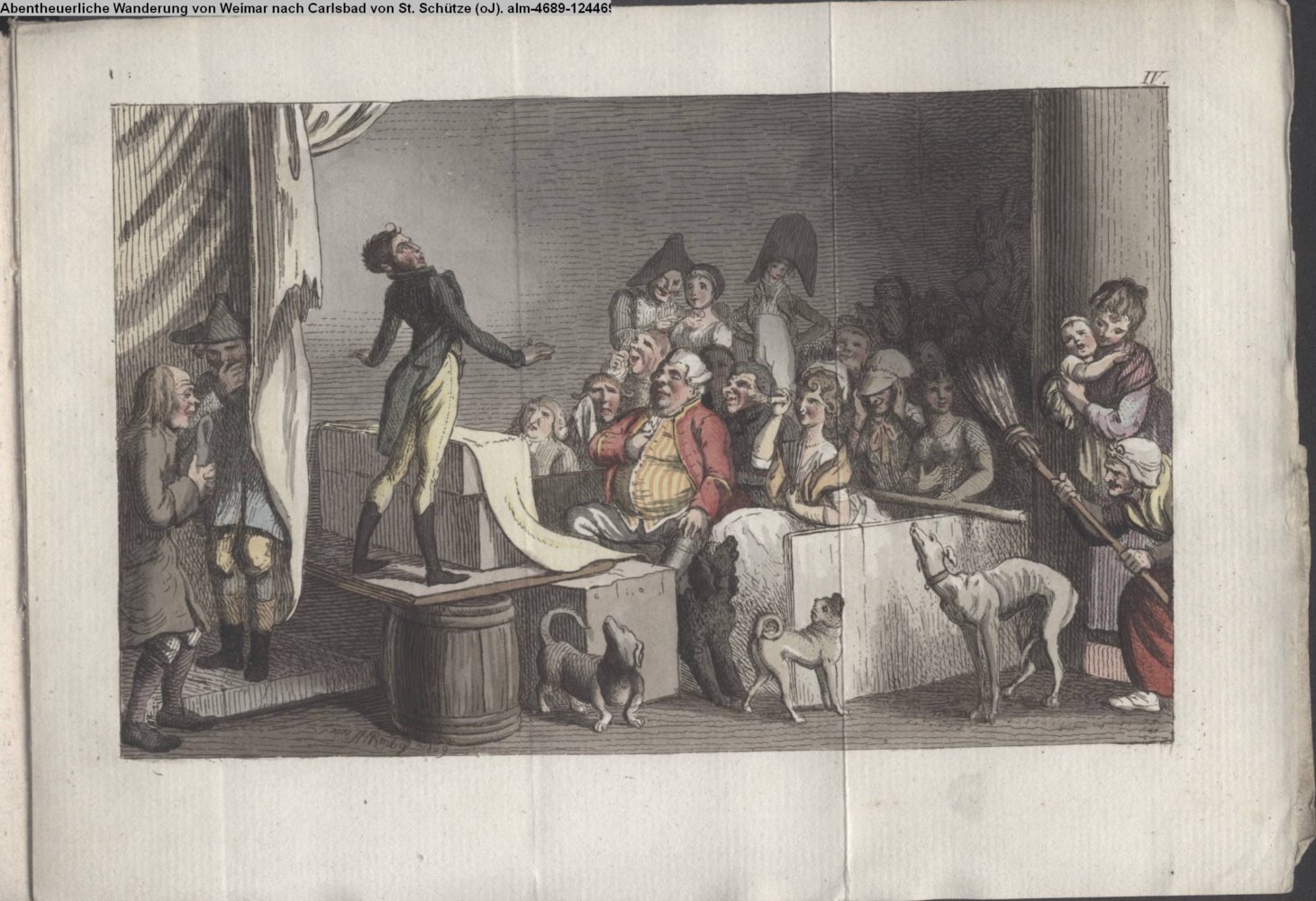 Nummerierung IV.; auszufaltende kol. Illustration zu »Abentheuerliche Wanderung von Weimar nach Carlsbad« von St. Schütze
