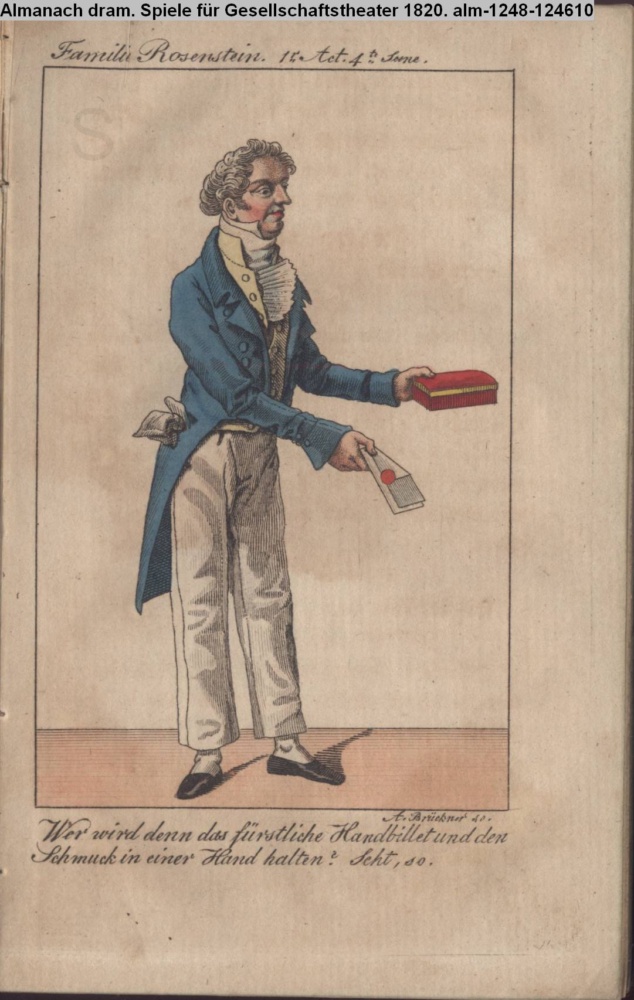 Familie Rosenstein. 1r Act. 4te Scene. / Wer wird denn das fürstliche Handbillet und den / Schmuck in einer Hand halten? Seht so.