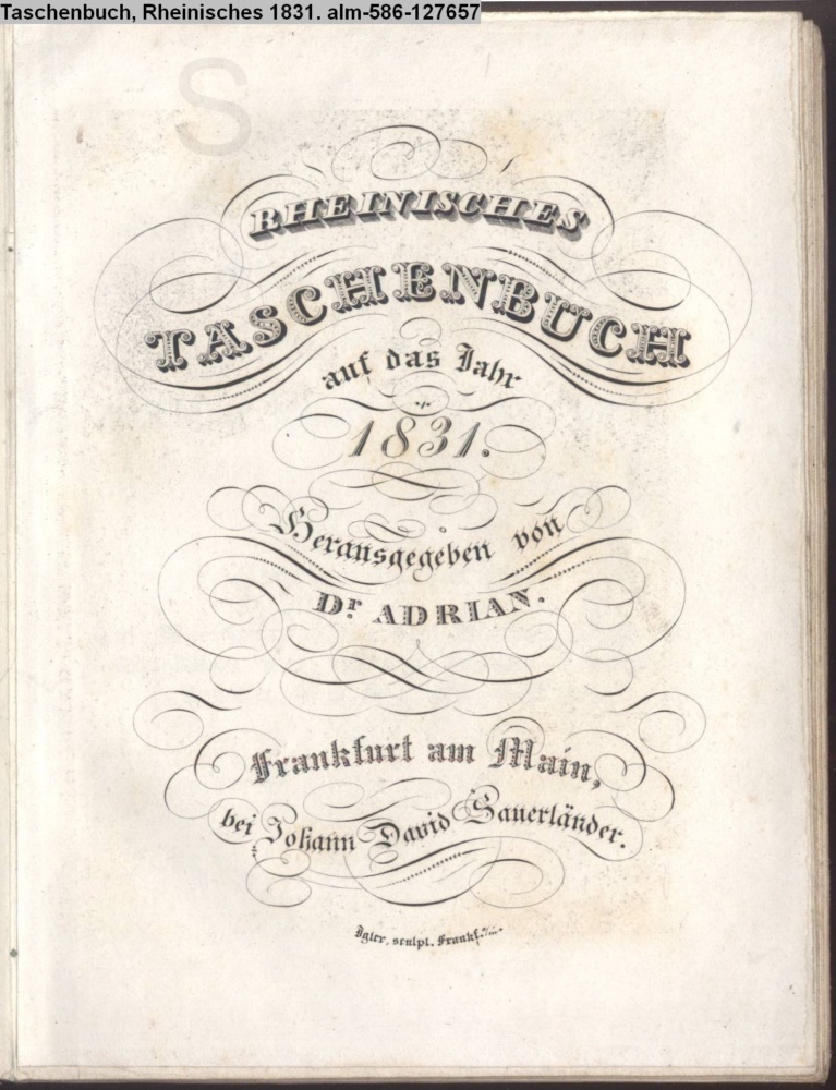 RHEINISCHES / TASCHENBUCH / auf das Jahr / 1831. / Herausgegeben von / Dr. ADRIAN. / Frankfurt am Main, / bei Johann David Sauerländer
