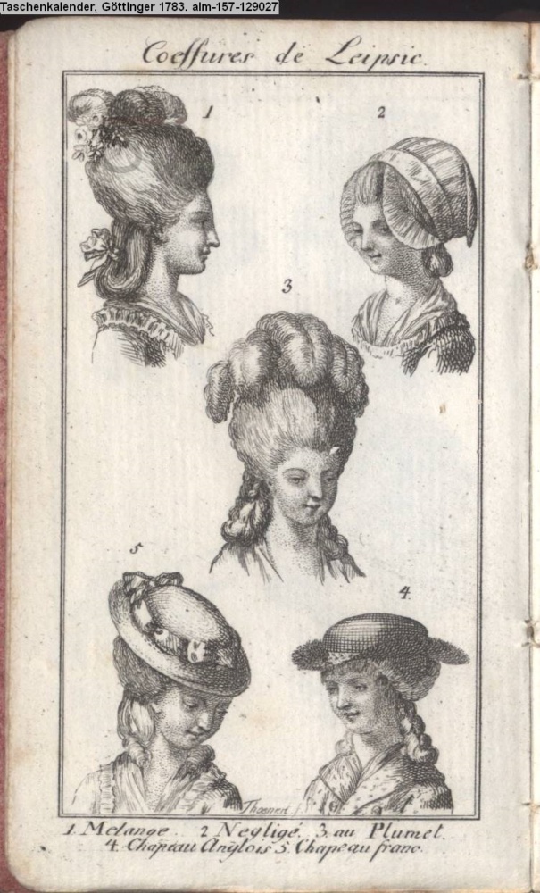 Coëffures de Leipsic. / 1. Melange. 2. Négligé. 3. au Plumel. / 4. Chapeau Anglois. 5. Chapeau franc
