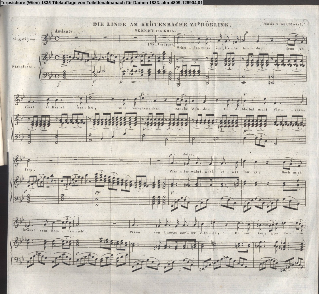 Vertonung des Gedichts »Die Linde am Krotenbache zu Döbling« von Emil d.i. J. F. E. Trimmel;