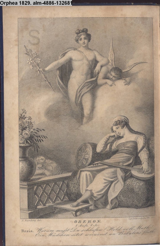 OBERON. / I. Aufz. 1. Sc. / Rezia. Warum mußt Du schlafen! Held voll Muth! / Ein Mädchen sitzt weinend an Babylons Fluth