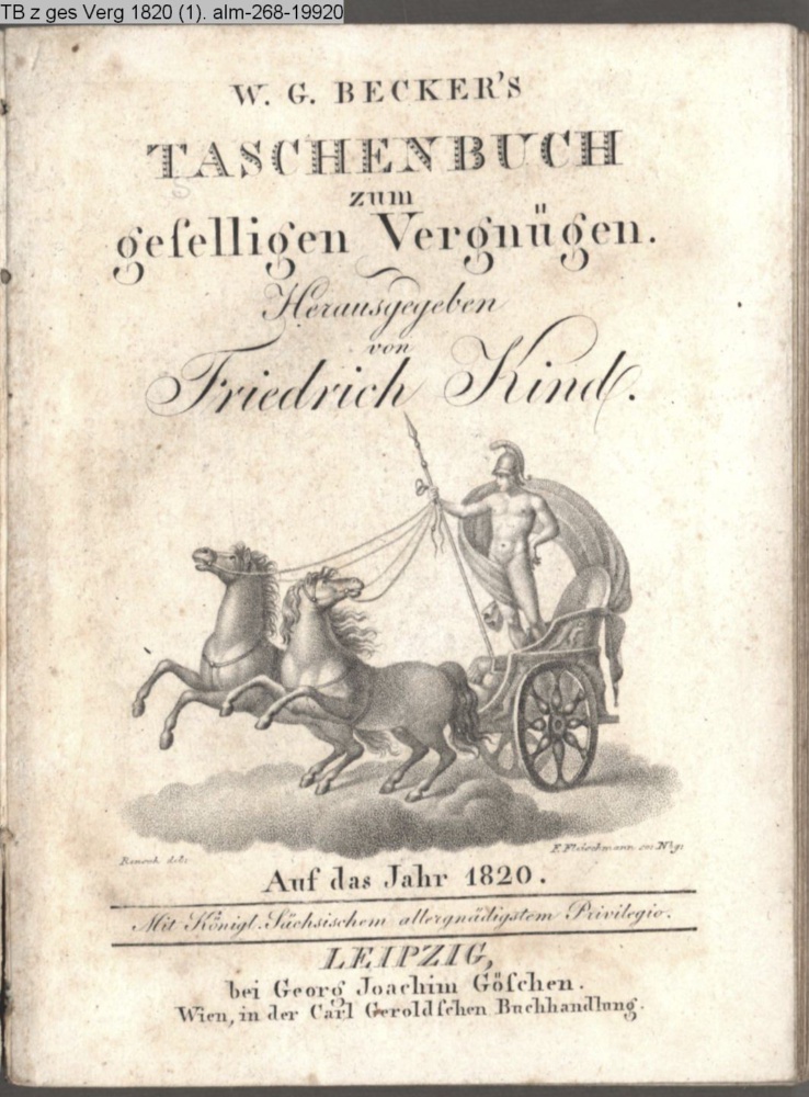 W. G. BECKER'S / TASCHENBUCH / zum / geselligen Vergnügen. / Herausgegeben / von / Friedrich Kind. / Auf das Jahr 1820. / Mit Königl. Sächsischem allergnädigstem Privilegio. / LEIPZIG, / bei Georg Joachim Göschen. / Wien, in der Carl Geroldschen Buchhandlung