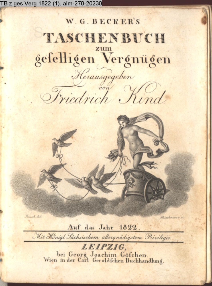 W. G. BECKER'S / TASCHENBUCH / zum / geselligen Vergnügen / Herausgegeben / von / Friedrich Kind. / Auf das Jahr 1822. / Mit Königl. Sächsischem allergnädigsten Privilegio. / LEIPZIG, / bei Georg Joachim Göschen. / Wien in der Carl Geroldschen Buchhandlung