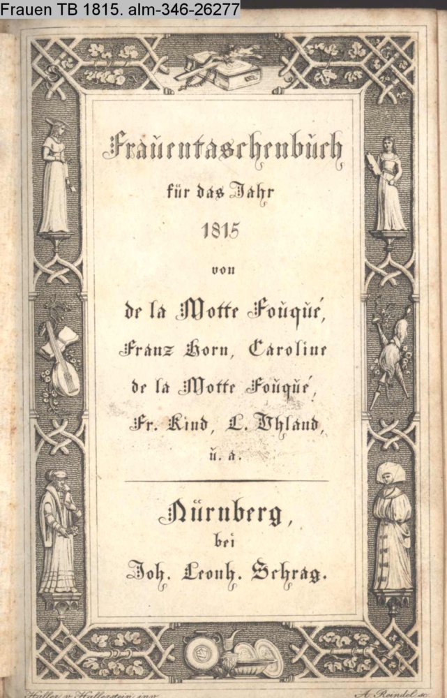 Frauentaschenbuch / für das Jahr / 1815 / von de la Motte Fouqué, / Franz Horn, Caroline / de la Motte Fouqué, / Fr. Kind, L. Uhland, / u. a. / Nürnberg / bei / Joh. Leonh. Schrag