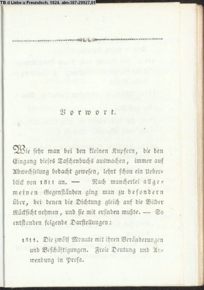 Wie sehr man bei den kleinen Kupfern, die den Eingang dieses Taschenbuchs ausmachen, immer auf Abwechslung bedacht gewesen, lehrt schon ein Überblick von 1811 an.…